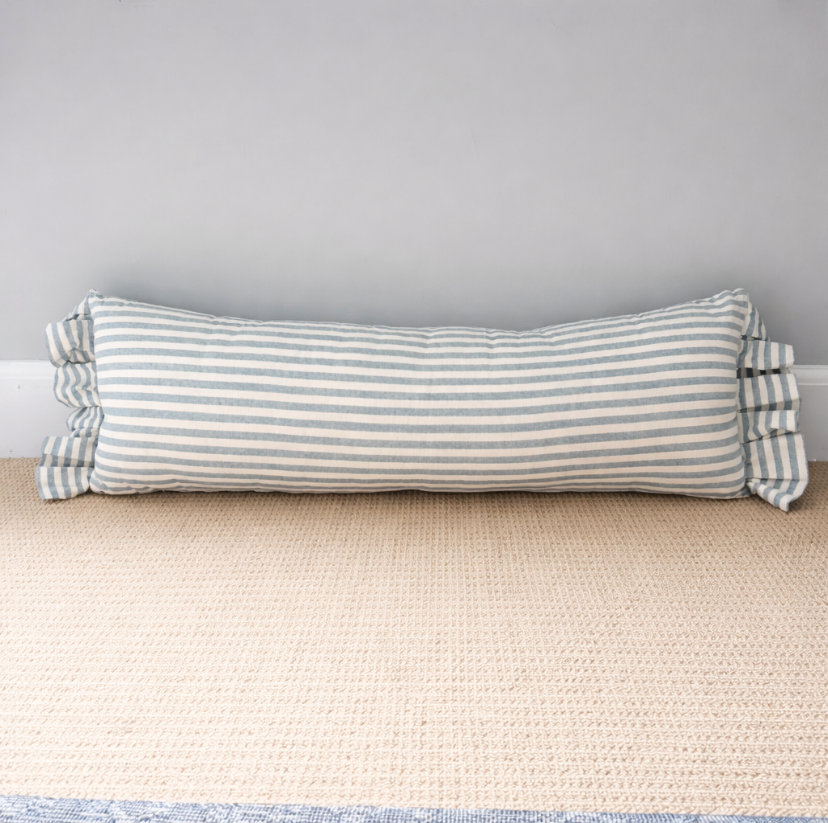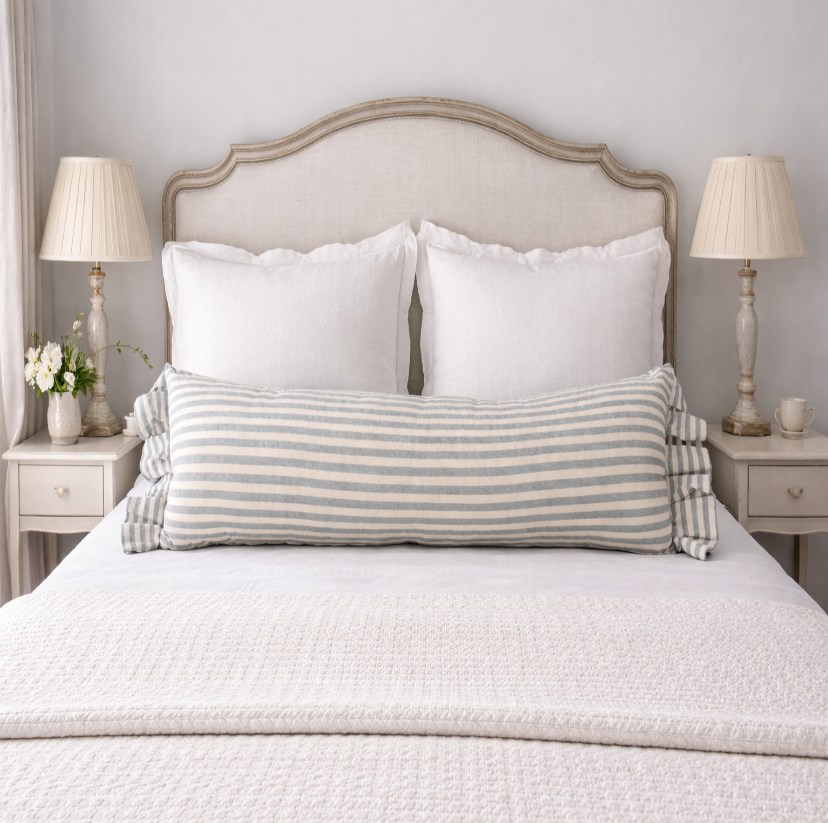 Add a bit of stately elegance to your home with this wonderfully stylish handmade bolster cushion. Place it on the bed or sofa for a beautiful French Country style. Handmade from linen and cotton blend with statement red zip closure. Horizonal stripes on one side, vertical on the other, with a beautifully-plump inner included.